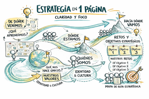 La Estrategia en una página no es un resumen bonito ni un ejercicio de síntesis estética. Es una herramienta de decisión. La utilizo para ayudar a equipos y direcciones a poner en un mismo plano lo esencial: de dónde venimos, dónde estamos, quiénes somos, hacia dónde vamos y cuáles son los retos y apuestas estratégicas reales. Cuando todo eso se ve a la vez, se hace evidente qué es estratégico y qué no, qué toca ahora y qué puede esperar.